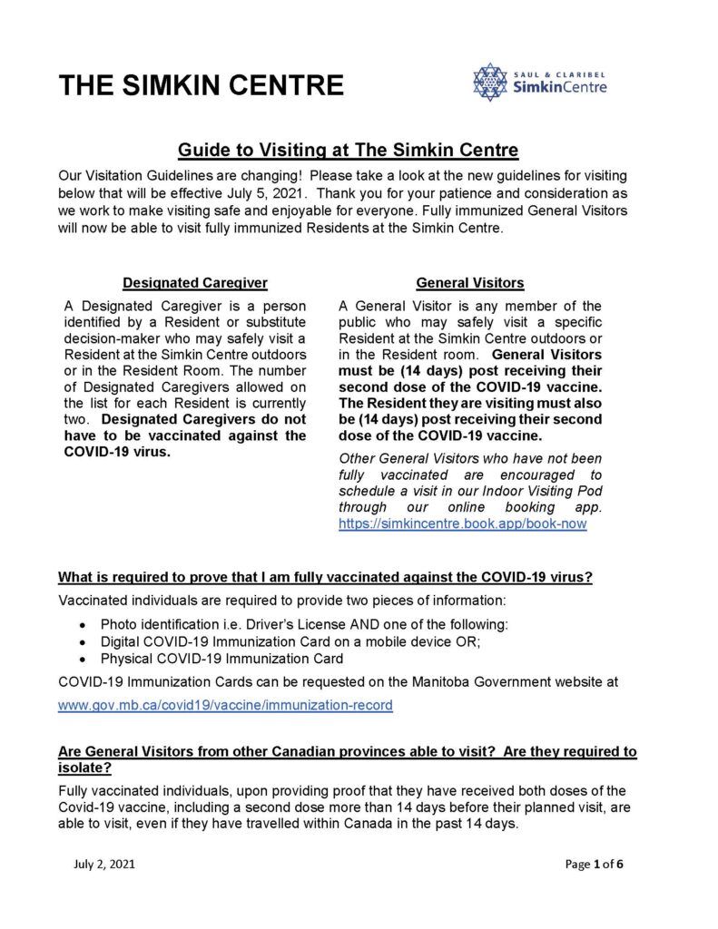 New Visitation Guidelines – Effective Monday, July 5, 2021